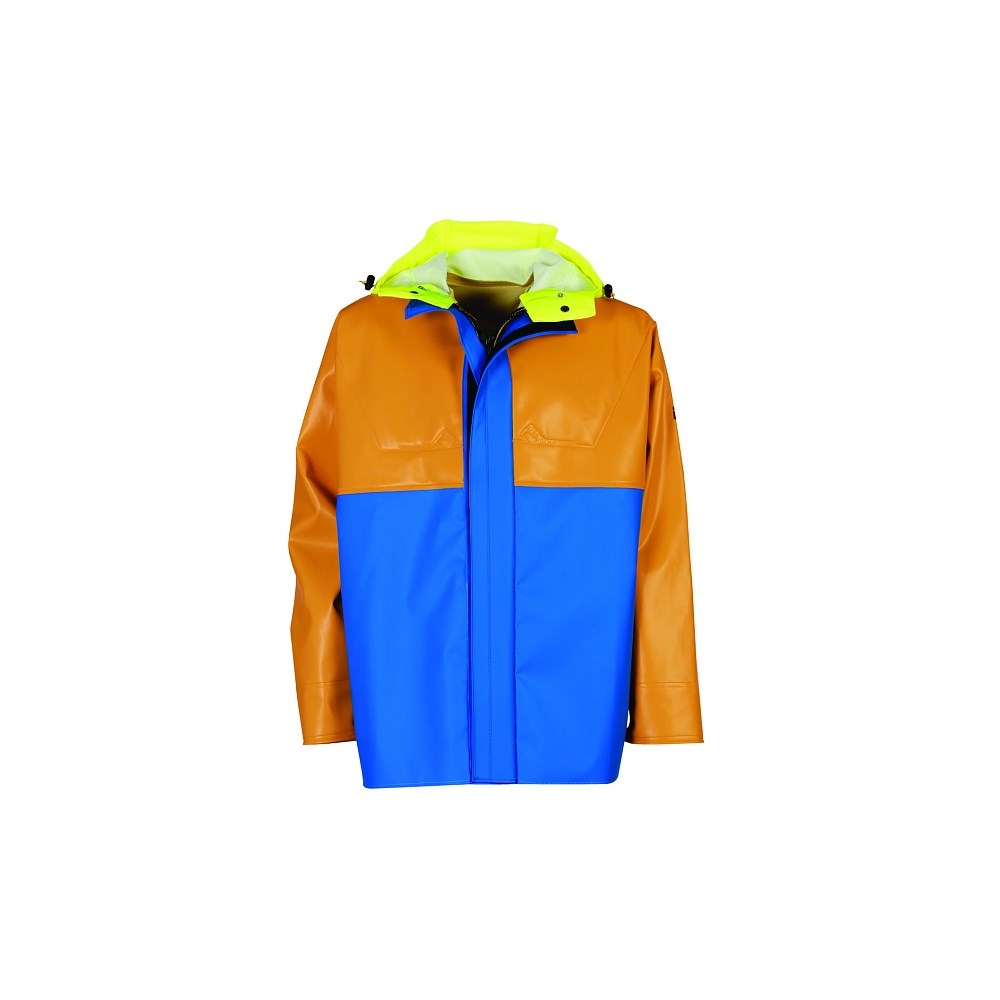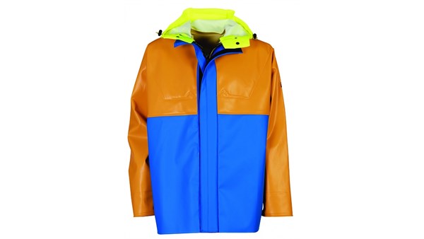 Regnjakke med glidelås i front. Mansjett belagt med pu i erm. Ekstra isolert på bryst.