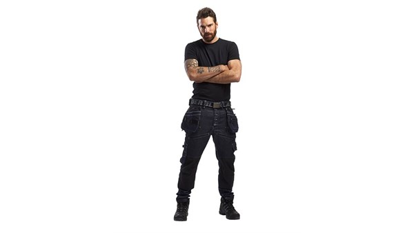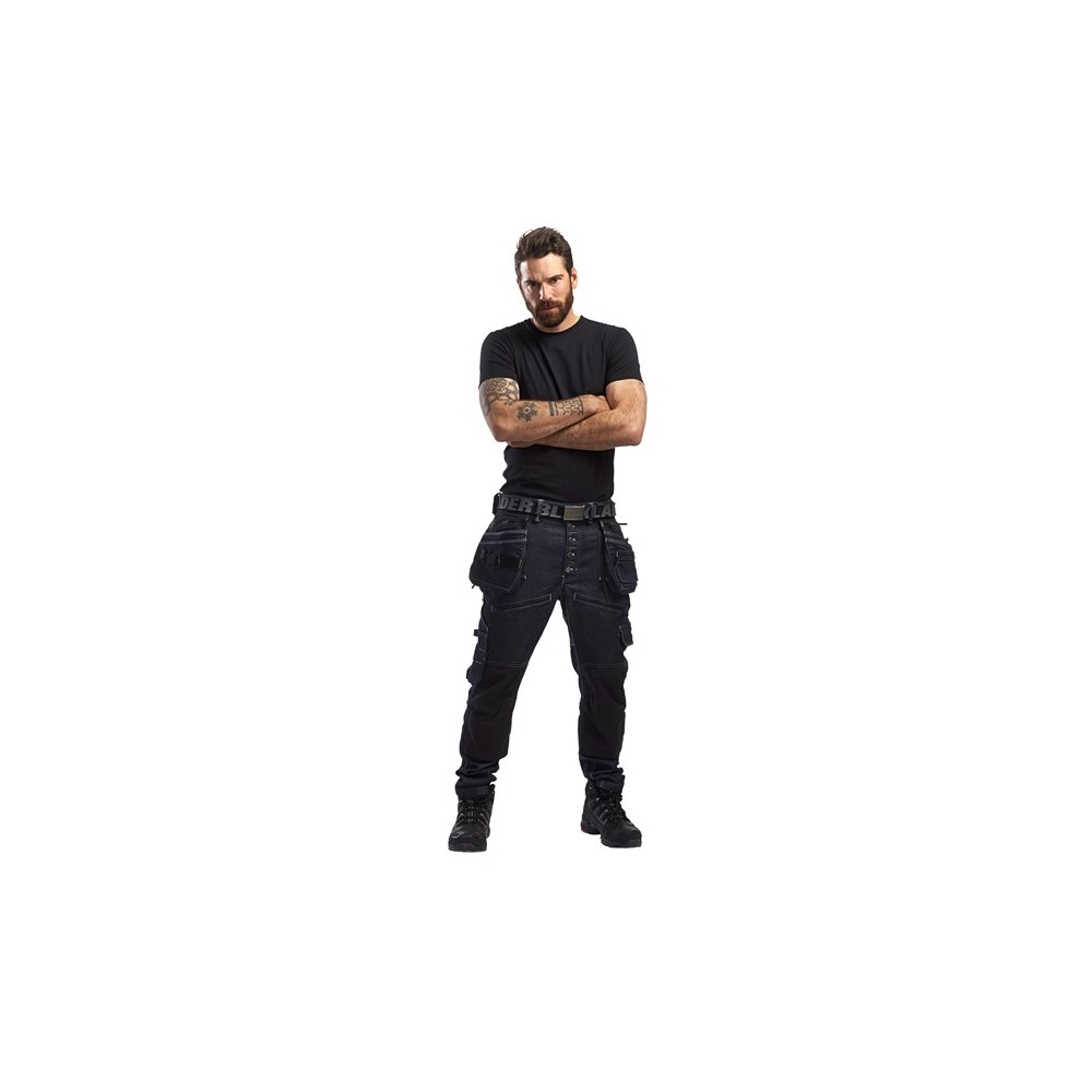 Slitesterk arbeidsbukse med lavt skritt. Modellen er en regular fit og er referert til i jeansindustrien som low crotch eller drop crotch med tapered leg, såkalte koniske ben. Buksen er laget av Cordura®denim med stretchfunksjon, og designet for å henge komfortabelt på hoften. For optimal bevegelsesfrihet og komfort har buksene stretchpaneler i skrittet og knehasene. Stoffet på knærne samt de funksjonelle lommene, er Cordura®1000 forsterket. Spikerlommene har glidelås som gir deg mulighet for å velge om du vil ha de på eller ikke.