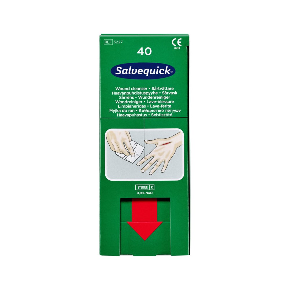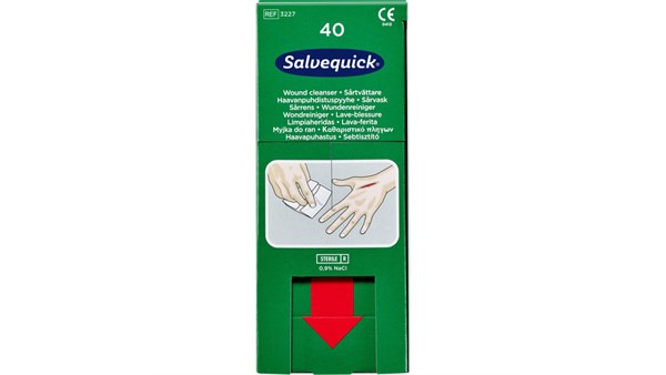 40 stk sårservietter med steril fysiologisk koksaltoppløsning.