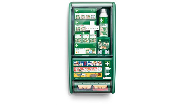 Transparent lokk og gummilister beskytter mot støv og fukt. Mål: B 29 x H 56 x D 12 cm. Innhold: 1 Øye- og sårrens spray 2 Cederroth 4-in-1 blodstopper 3 Cederroth 4-in-1 liten blodstopper 1 Cederroth beskyttelsespakke (maske, hansker, Cederroth Safety Hand cleanser) 1 x 20 stk Salvequick sårvask 1 Salvequick plasterautomat (inkl. 40 tekstil- og 45 plastplaster) 1 x 2 stk Burn Gel kompress 1 Førstehjelpsinstruksjon 1 nøkkel.