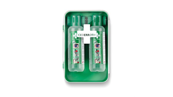 Et kompakt øyedusjskap som beskytter mot støv – og vann. Inkluderer 2 flasker Cederroth Øyedusj. Lett å få plass til også i mindre rom. Transparent lokk for høy synlighet. Flaskene åpnes automatisk når de vris ut av holderne, og skylling kan starte øyeblikkelig.