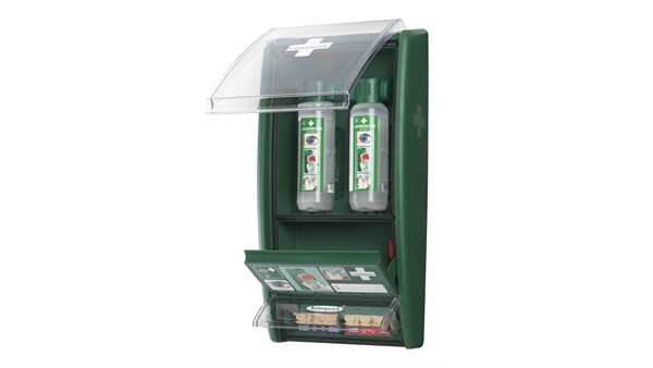Mål B29 x H55 x D12 cm. Ineholder 2 øyedusjflasker 500ml, 1 Salvequick plasterautomat, 1 øyedusjinstruksjon, 1 nøkkel