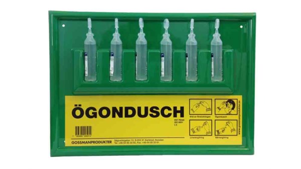 Øyeskyllestasjon med 6 stk øyenskylle flasker natriumklorid.Enkelt modell. Lett å fylle på. Øyeskyll for fjerning av skitt, sår rengjøring og linse rengjøring.