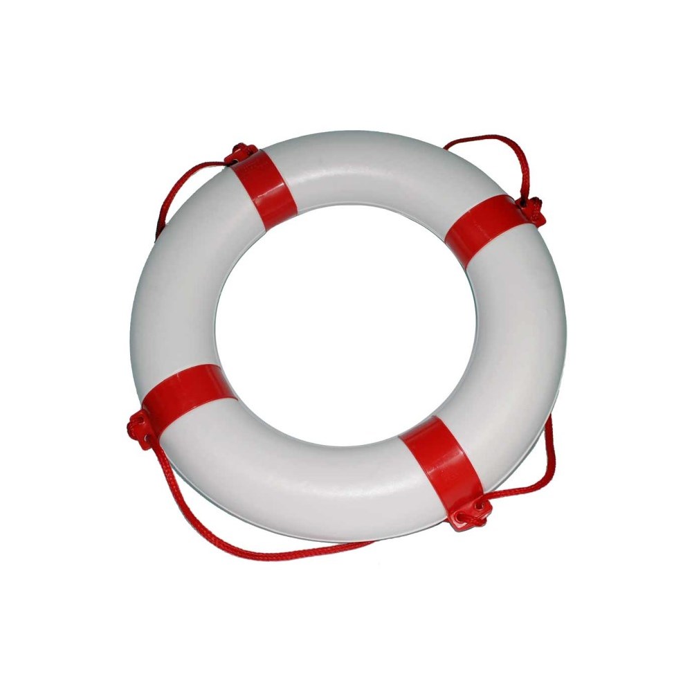 Rød og hvit livbøye trukket med PVC. Utvendig diameter: 65 cm Innvendig diameter: 40 cm Vekt: 800 gram
