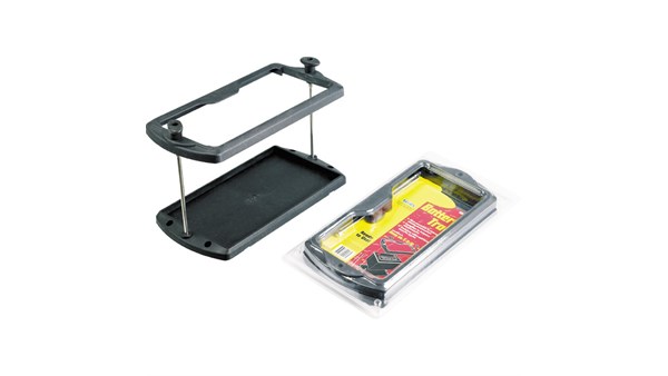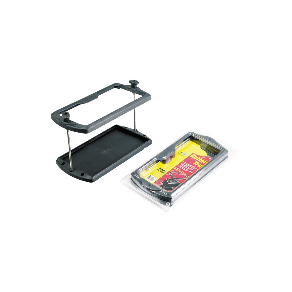 Solid holder for start- og forbruksbatteri. Produsert i kraftig spesialplast med meget høy styrke. Hel bunnplate for fastmontering. Rustfrie bolter med store vingemuttere i toppen for enkelt å kunne åpne og låse batteriet fast.