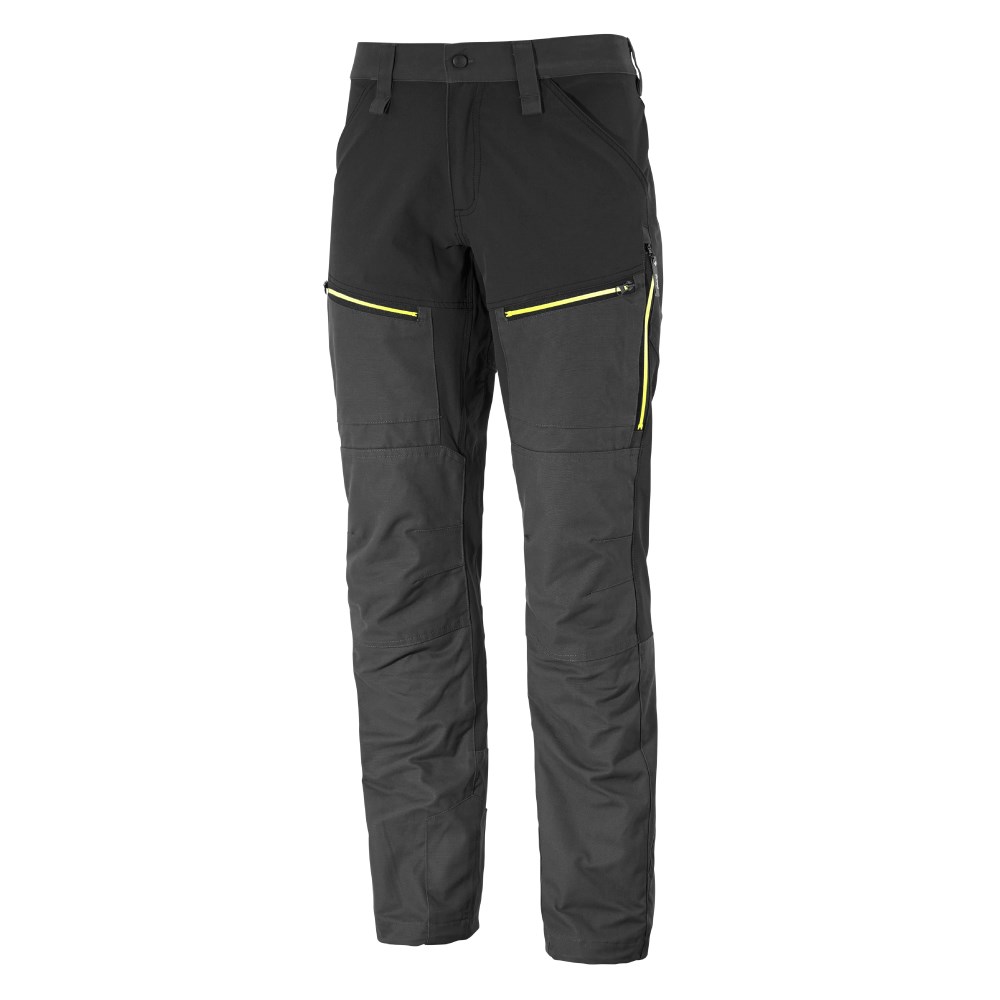 Bukse i kombinasjonsmaterialer. Stretchmateriale for økt komfort og bevegelighet, vevd bomull for økt slitestyrke og komfort. To sidelommer, to lårlommer med glidelås, en baklomme med glidelås. Glidelåser for ventilering i sidene på låret. Gule synlighetsdetaljer. Snøring nede på bein. Forsterkning på utsatte steder.