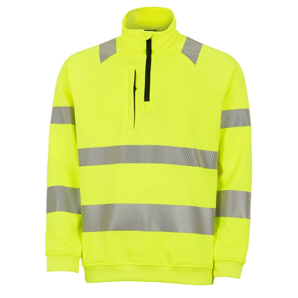 Collegegenser med halvzip av mykt og behagelig materiale. Segmenterte reflekser for ekstra stretchegenskaper og økt pusteevne. Kort glidelås foran, brystlomme med glidelås. Ribb i ermer og nederst. CE: EN ISO 20471 klasse 2 (størrelse XS) klasse 3 (størrelse S-5XL).
