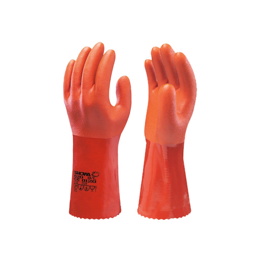 Hanske for bruk innen kjemisk og petrokjemisk industri, bygg og anlegg, fiskeri, landbruk, maling, håndtering av syrer og baser, etc. Smidig hanske for bruk i vått miljø. Ru overflate. Strikket bomullsfôr uten sømmer. Heldyppet, belagt med PVC. Tykkelse 1,1 mm. Lengde 30 cm.