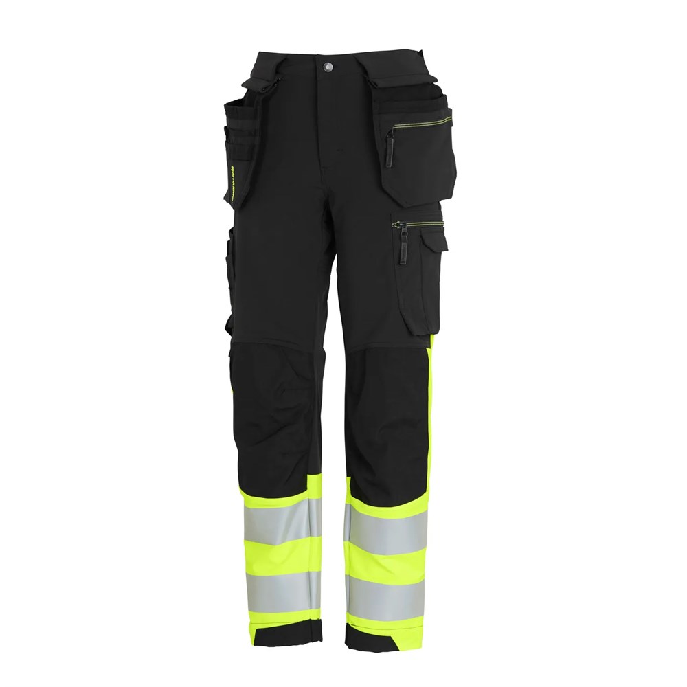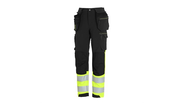 Bukse i full stretch for maksimal komfort og bevegelighet. Materialet er lett vannavvisende. Flyttbare og avtagbare hengelommer, smart løsning for venstrehendte. Hengelommer med plass til verktøy og blyanter. Venstre hengelomme har ekstra sikkerhetslomme med glidelåslukking. D-ring, nøkkelring, ID-kortholder i venstre benlomme. Doble hammerholdere, samt borrelåshempe for feste av hammerholder. Side- og baklommer. Tommestokklomme, knivknapp, pennelomme på høyre ben. Stor benlomme med glidelås og mobillomme på venstre ben. Forsterkning i polyamid på utsatte steder. Midjejustering for best passform. Knebeskytterlommer for korte og lange knebeskyttere. Varselsertifisering. Oeko-Tex SE 10-192.