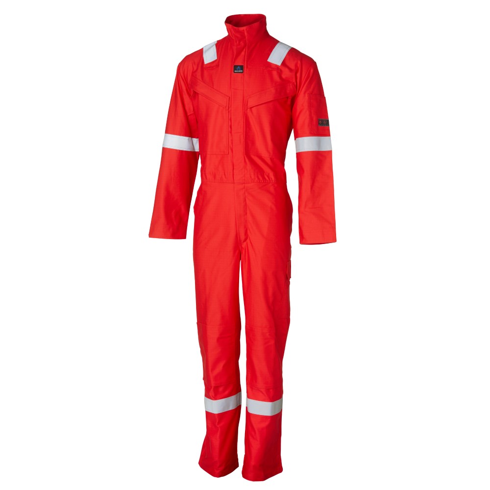 Metallglidelås skjult bak stolpe i front / Brystlommer / Armlomme / Stikklommer / Baklommer / Tommestokklomme / Knelommer / Metalltrykknapper i hals, klaffer liv og ermer / Fold i rygg / Godkjent etter EN531.