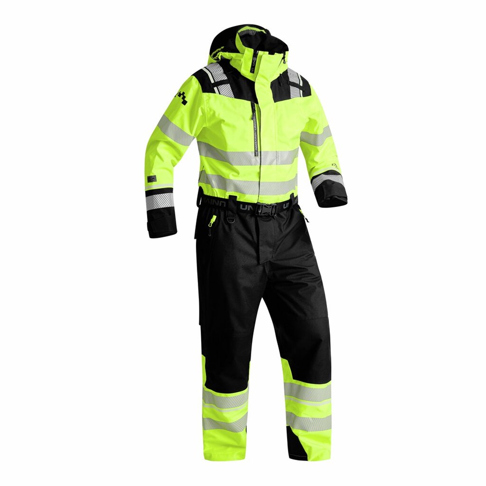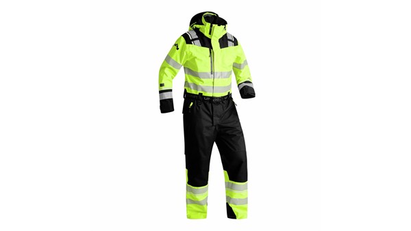 Helt vind- og vanntett skalloverall i Dope-dye-innfarget tekstil og med meget god pusteevne. Fôr i gjenvunnet polyester. 2-veis glidelås i front. Regulerbar halsåpning med vanntette glidelåser for økt komfort og ventilasjon. Avtakbar, hjelmtilpasset hette med flere justeringsmuligheter og forsterket skjermkant for best mulig beskyttelse og sikt Vanntette glidelåser i ryggsiden for mekanisk ventilasjon. Brystlomme med vanntette glidelåser og ID-kortlomme. 2 benlommer med vanntett glidelås og mykt, varmende fôr i merinoull. Mobillomme under knepping. To innerlommer. Håndleddvarmere med tommelgrep. Regulerbare ermeavslutninger. Elastikk i midten og elastisk, avtakbart belte. Glidelåser i bukseben opp til knærne. Regulerbar fotvidde med snølås. Forbøyde bukseknær med innvendige knebeskytterlommer. Tommestokklomme. Velcrofester for hammerholder. Forsterkningsmateriale på knær og benavslutning. To baklommer med klaff. Segmenterte reflekser og Signal Lucence-teip for økt synlighet og sikkerhet. Vannsøyle: 20.000mm. Pusteevne: 22.000/m2/24h. Miljømerking: Oeko-tex, Dope-dyed. Certifikat: EN 20471 kl.3, 25 vask. EN 343 4,4,X.