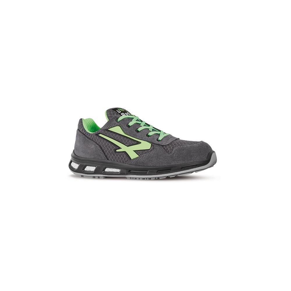 For tørt arbeid inne og ute, lager, lettere industri, service, transport, håndverk, lager/logistikk etc. Svært gode dempende egenskaper med Infinergy mellomsåle fra BASF. Overdel i pustende semsket skinn, grå med grønne detaljer. WingTex pustende fôr. Vekt 515 gram (1 stk i str 42). Yttersåle i PU, oljebestandig og antistatisk. Sklihemmende egenskaper på keramiske fliser og stålunderlag (SRC). Polstret pløse og hælkappe. Tåvernehette i perforert aluminium. Spikertrampsåle i kompositt.