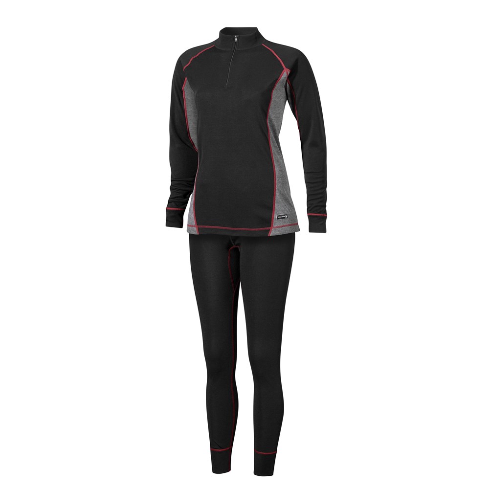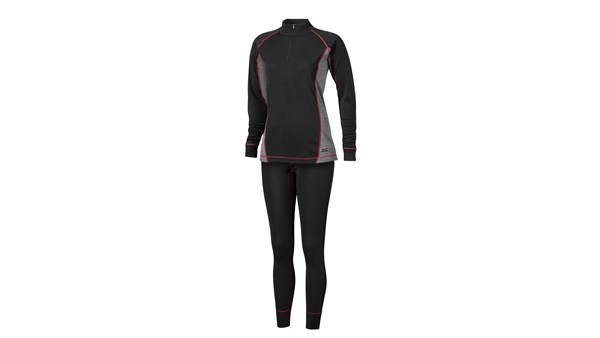 Tynt og behagelig sett i 100% polyester. Bukse med strikk i livet og ribb rundt anklene. Trøye med lang rygg og polokrage med glidelås. Damepassform.
