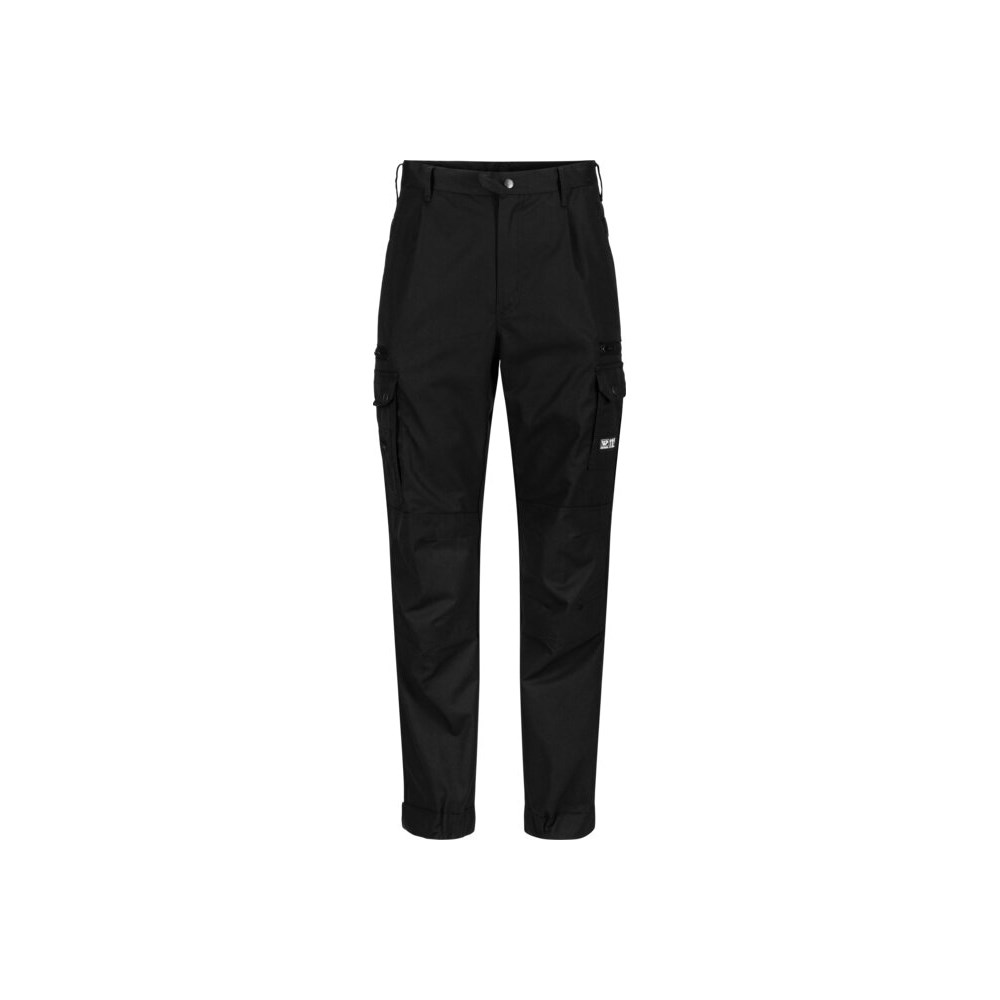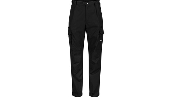 Linning med knapp, og glidelås i gylf, beltestropper, D-ring. Bærestykke bak, 2 sidelommer, 1 baklomme med glidelås under klaff. 2 passepoilerte lommer med glidelås, 2 lårlommer med klaff, med 1 liten utvendig passepoilert lomme med glidelås på høyre lårlomme. kneputelommer, og stramming av ben
