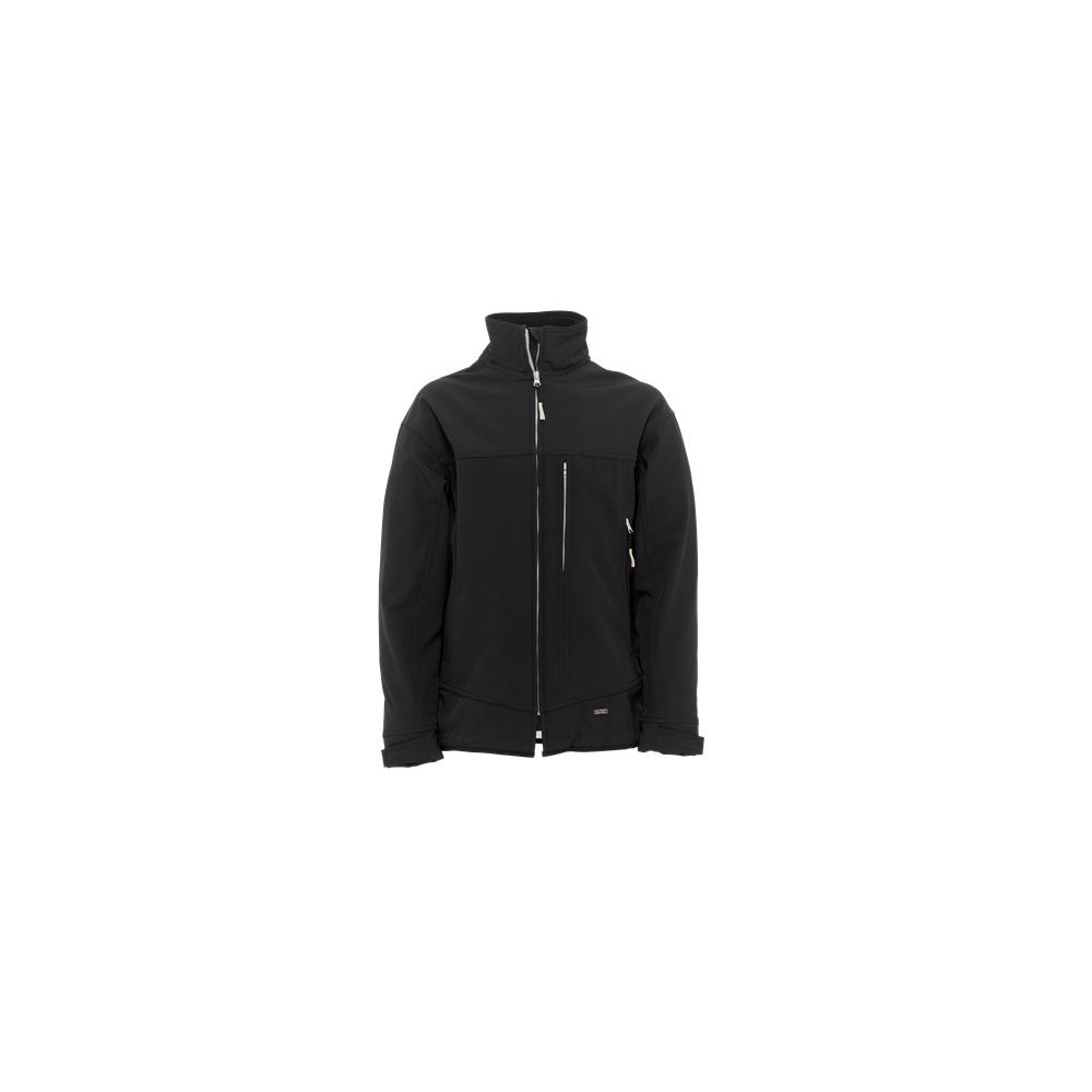 Softshelljakke med høy krage, glidelås foran, brystlomme på venstre side, to fremlommer, begge med glidelås i hvit kontrastfarge. Ermer og nedkant med stramme mulighet.