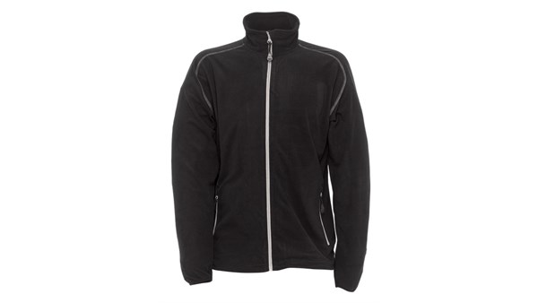 Fleecejakke med glidelås i front, og sømmer i kontrastfarge. To lommer i front med glidelås. Justebar i nedkant med snøring.