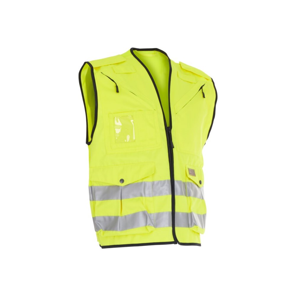 Slitesterk uniformsvest med glidelås i front. Pustende stoff på rygg. To brystlommer med glidelås, den ene med to blyantlommer, ID-kortlomme. To frontlommer med topp og sideåpning, samt trykknapp. Justering i nedkant. To Refleksstriper for bedre synlighet.
