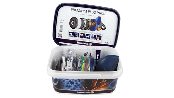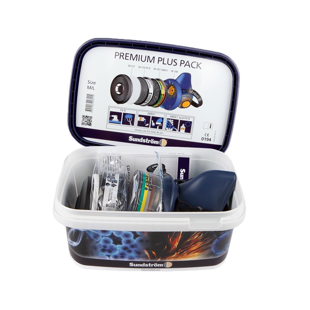 Premium+ Pack H05-0003 som inneholder halvmaske SR 100 størrelse M/L, partikkelfilter SR 510 P3 R, gassfilter SR 297 ABEK1, forfilter, forfilterholder og rengjørings serviett.