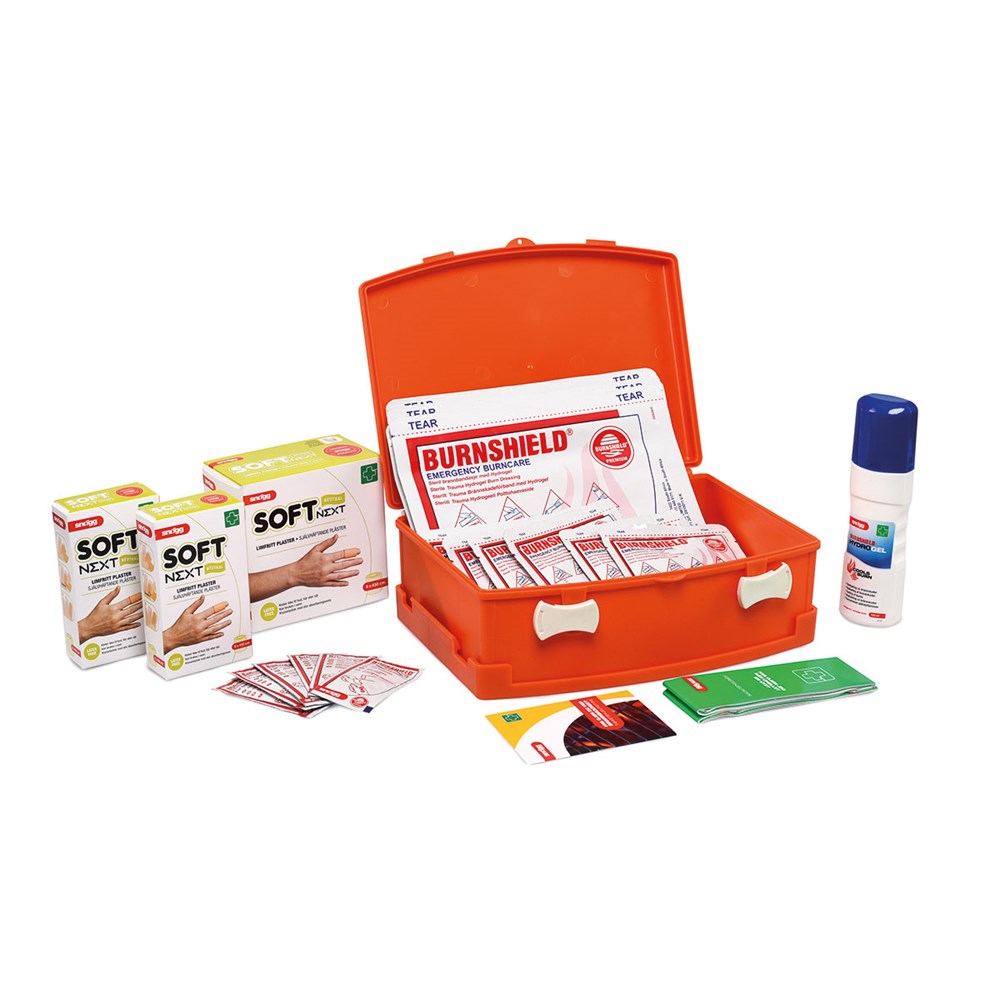 Innholdsrikt brannskadeskrin som er anbefalt til bruk som beredskapsskrin for små og mellomstore brannskader. Brakett for veggmontering medfølger.