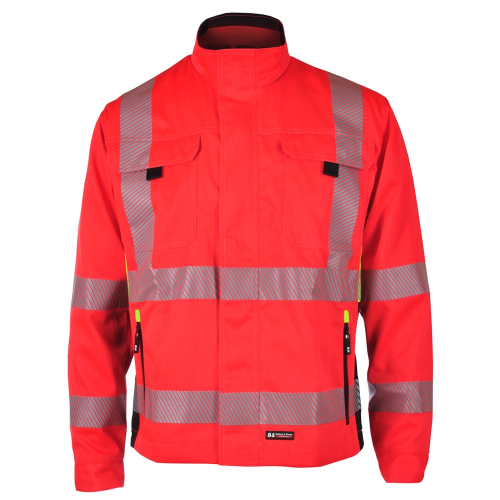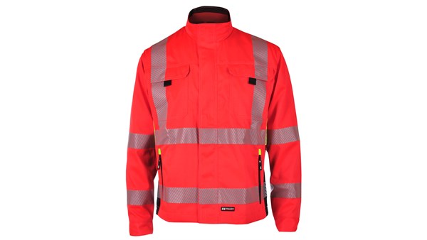 Meshfôret jakke med to stikklommer med glidelås, to brystlommer og id-kortlomme. Glidelås med klaff og borrelås i front. Linning med trykknapper rundt håndledd. Refleks på mage, ermer og skuldre.