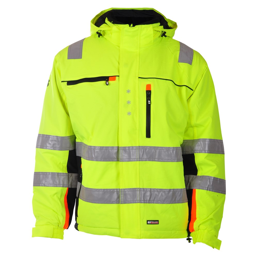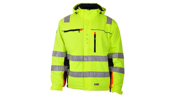 Vattert lang vinterjakke med avtagbar hette. Kraftig fôr. Borrelåsstramming rundt håndledd og håndvarmer/pulsvarmer. To brystlommer og sidelommer med glidelås. Id-kortlomme. Glidelås med klaff i front. Vanntett 8000 mm, pustende 5000 mvp. EN 471 kl. 3.