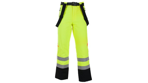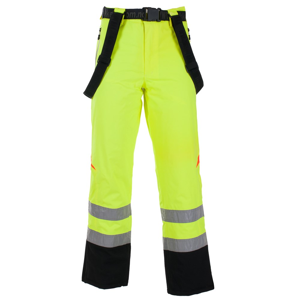 Vattert bukse med seler og belte. Glidelås med klaff i front, baklomme med klaff, to stikklommer og glidelås i bein. Vanntett 8000 mm, pustende 5000 mvp. EN471 klasse 1.