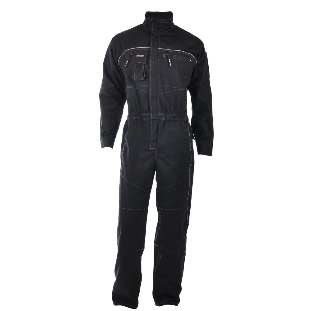 Kjeledress med fold i rygg, strikk i liv, glidelås i front med klaff, gjennomgrep og stikklommer. Tommestokklomme, brystlommer, lårlommer, mobillomme og baklommer. Knelommer.