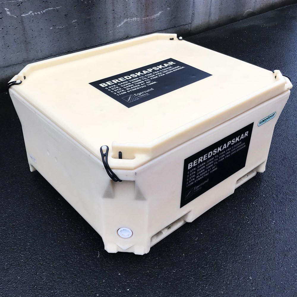 460 liter kar, fem sammenknytte garn i tre forskjellige størrelser,