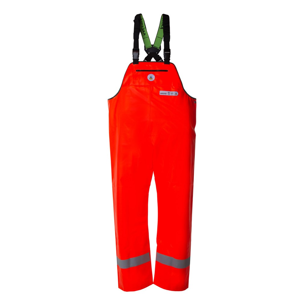 Lakkert PVC belagt bomull/polyester 480 g/m2,. kraftig materiale (for mekanisk slitasje),. ekstra glatt overflate gir lettere renhold, ekstra god rivestyrke. i både tørr og våt tilstand, kulde- olje- og fettbestandig, lun innside. Sydde og sveisede sømmer • Mobillomme med vannavvisende glidelås. • Høyere liv, vifte med trykknapp, kraftig hempe for oppheng. • Refleks . • Avtagbart flyteelement festes til buksen med glidelås.. For komplett flytebukse må følgende også bestilles: Varenr 71002flyt; 990-0261 Doggerbank flyteelement. EN 343 • Med Doggerbank flyteelement: EN ISO 12402-6 (50N).