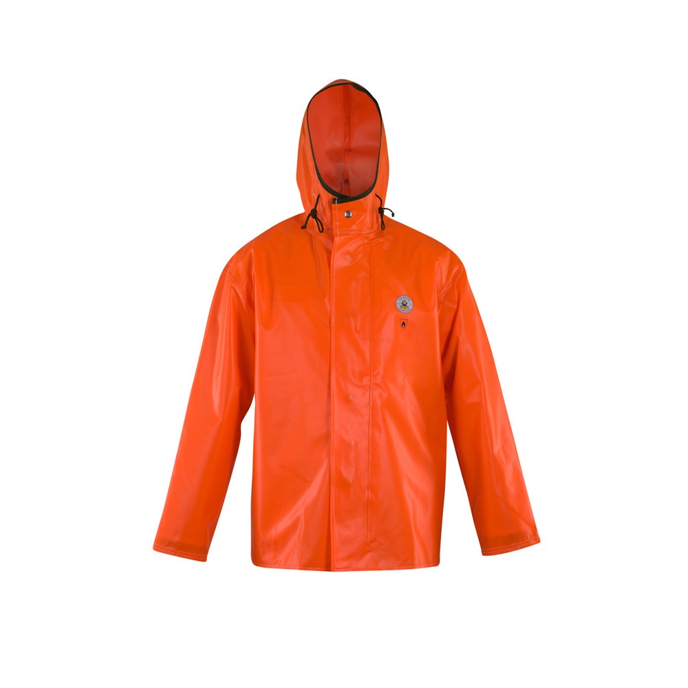 PVC belagt lakkert polyester 325g/m2. Flammehemmende. Kraftig materiale (for mekanisk slitasje) ekstra glatt. overflate gir lettere renhold, kulde, olje og fettbestandig.. Lun innside. Sydde og sveisede sømmer. Skjult knapping i front med stormklaff. Snorregulering i hette.