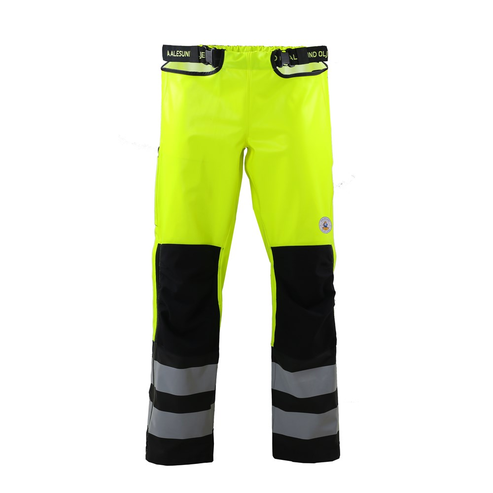• PVC-belagt polyester, 325 g/m2. • Kraftig materiale (for mekanisk slitasje), ekstra glatt over?ate gir lettere renhold. • Kulde-, olje- og fettbestandig. • Lun innside. • Sydde og sveisede sømmer. • 70mm påsveiset re?eks. • Fasongsydd bukse • Regulerbart strikk i livet med klips. • Åpning for verktøylommer i livet. • Forsterket kneparti • Vannavvisende glidelås utside ben, opptil kne. • Dobbel tommestokklomme m/knapp for kniv og hempe.