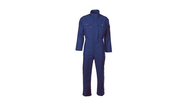 100% Bomull 350 g/m². Pyrovatexbehandlet, materialet er flammehemmende i hele. plaggets levetid.. Myk og behagelig kvalitet, god komfort. Metallknapper i front, skjult med klaff. fold i rygg. Brystlommer med trykknapp og klaff. Elastikk bak i livet. Sidelommer med gjennomgrep. Baklommer med klaff. Pennelomme på erme. Trykknappregulering på ermer. Tommestokklomme. Kneputelommer.