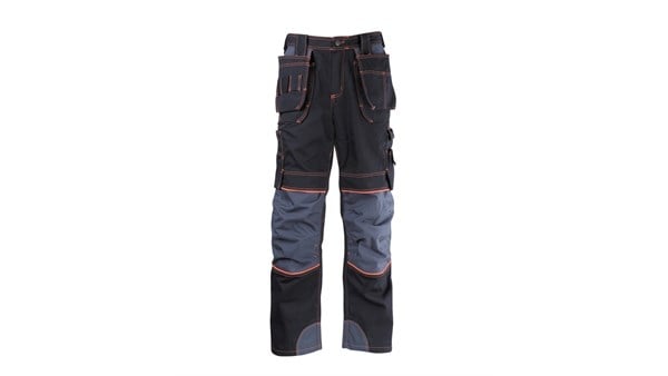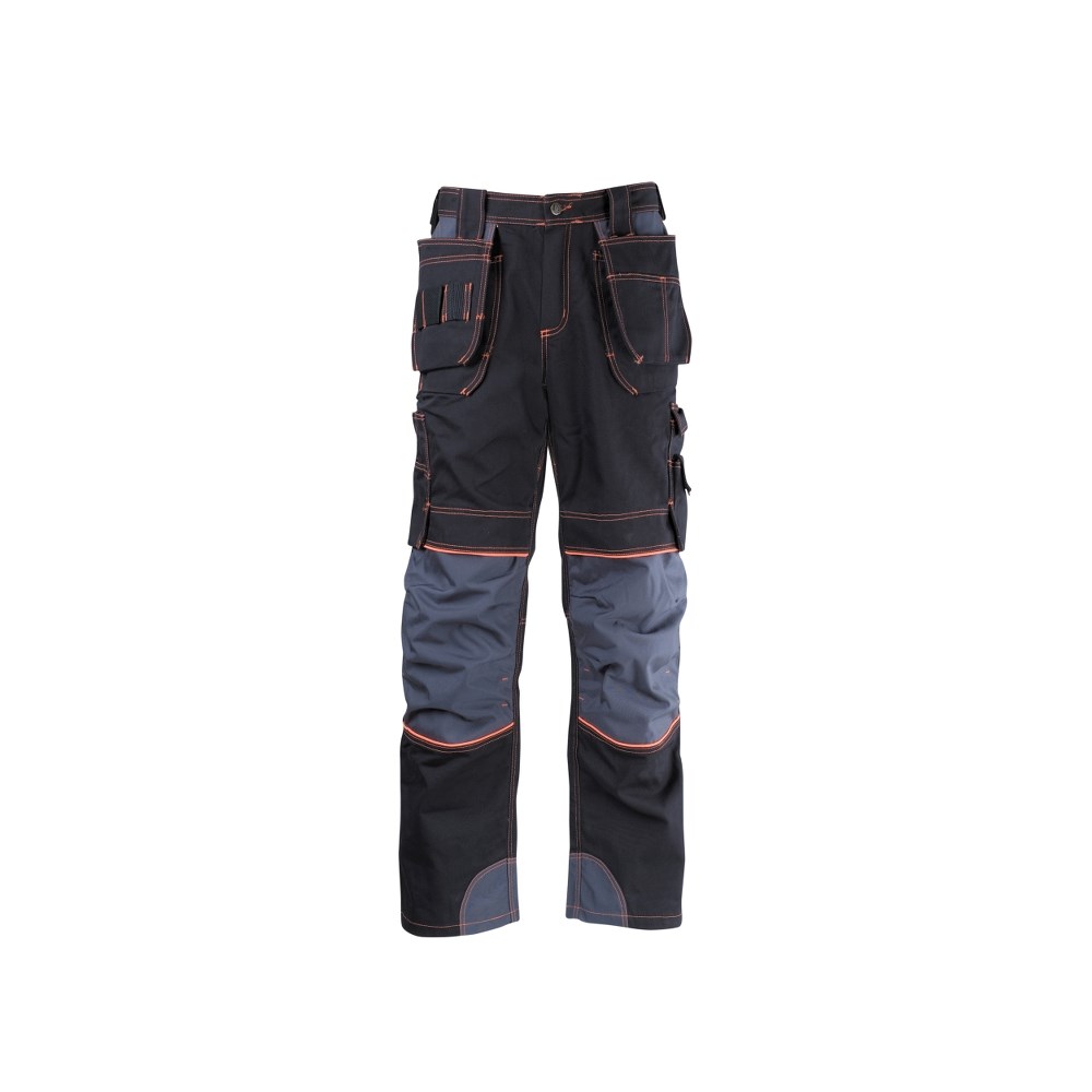 Enveis glidelås på forsiden, skjult med klaff og synlige metallknapper. Frontlomme. Jeansshape med gore og formede knær - Sidelommer - Rygglommer - Dobbelthengende lommer - Dobbelt linjelomme med knapp for kniv - Benlomme med klaff og mobillomme - Knelommer med toppåpning - Forsterket kne, hengende og baklomme