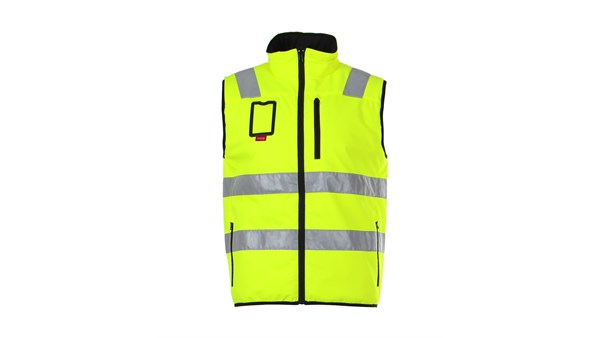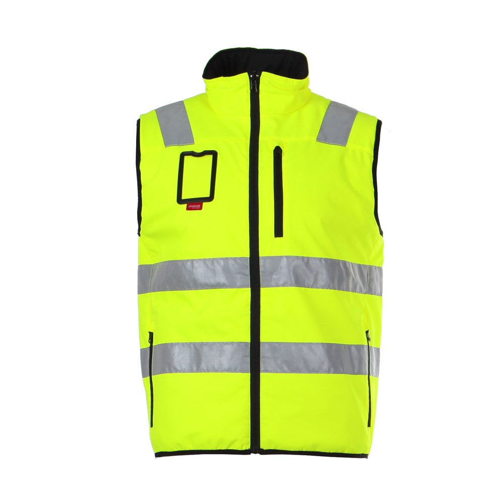 100% Polyester laminert, 135 g/m2. 100 g/m2 vattering, Vendbar, vattert vest. Lett og behagelig kvalitet. Fluoriserende vest. 50mm og 70mm påsydd re?eks, tonåls søm,Glidelås i front. Brystlomme med glidelås, ID-lomme, Stikklommer med glidelås. Sort vest. Glidelås i front. Stikklommer med glidelås. XS-4XL ISO 20471 kl. 2 XS-S ISO 20471 kl.1.