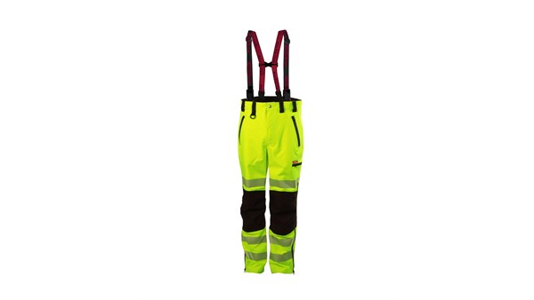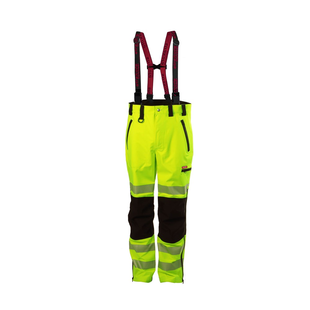 3-lags laminert skallstoffYtterstoff: 100% polyester, mellomstoff: PU-filminnerstoff: 100% nylontrikot, 195 g/m2 .Pustende, vind- og vanntett; 10000mm vannsøyle. Lett kvalitet, tapede sømmer , 50mm segmentert refleks ,avtagbare og regulerbare seler ,D-ring i beltestropp, sidelommer med glidelås, tommestokklomme med dreneringshull, lårlomme med glidelås, fasongsydde kneparti for god bevegelighet, forsterket med Cordura, glidelås i sidene opp til kne, borrelåsregulering nedkant ben.