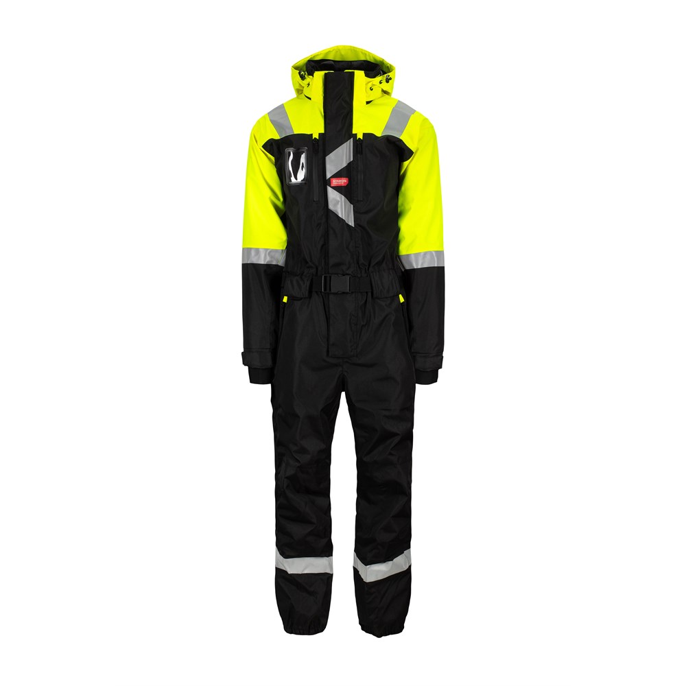 100% Polyester med PU bakside, 170 g/m2. Mesh-fôr. Pustende, vindtett og vanntett. Svært slitesterk.Skjult kartlomme i front. Ermribb med tommelgrep. 50mm påsydd re?eks, sydde og tapede sømmer. Avtagbar regulerbar hette. Elastisk belte i livet. Skjult glidelås i front med klaff og borrelås. Ermribb med tommelgrep. ID-lomme og D-ring. Lufting under ermer. Glidelås i hele benets lengde. Bryst- og sidelommer med vannavvisende glidelås. Innvendige brystlommer med borrelås. Elastikk og knapp i nedkant ben. Borrelåsregulering og elastikk i nedkant ermer.