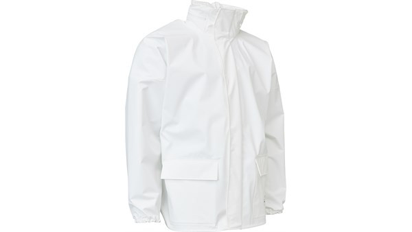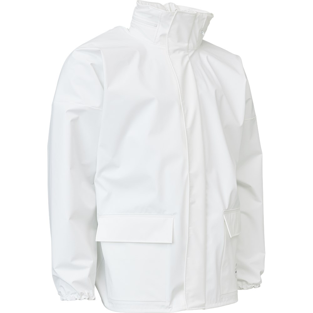 Skjult hette med snor YKK-glidelås med stormklaff 2 lommer med klaffer Elastiske ermer og elastisk kant