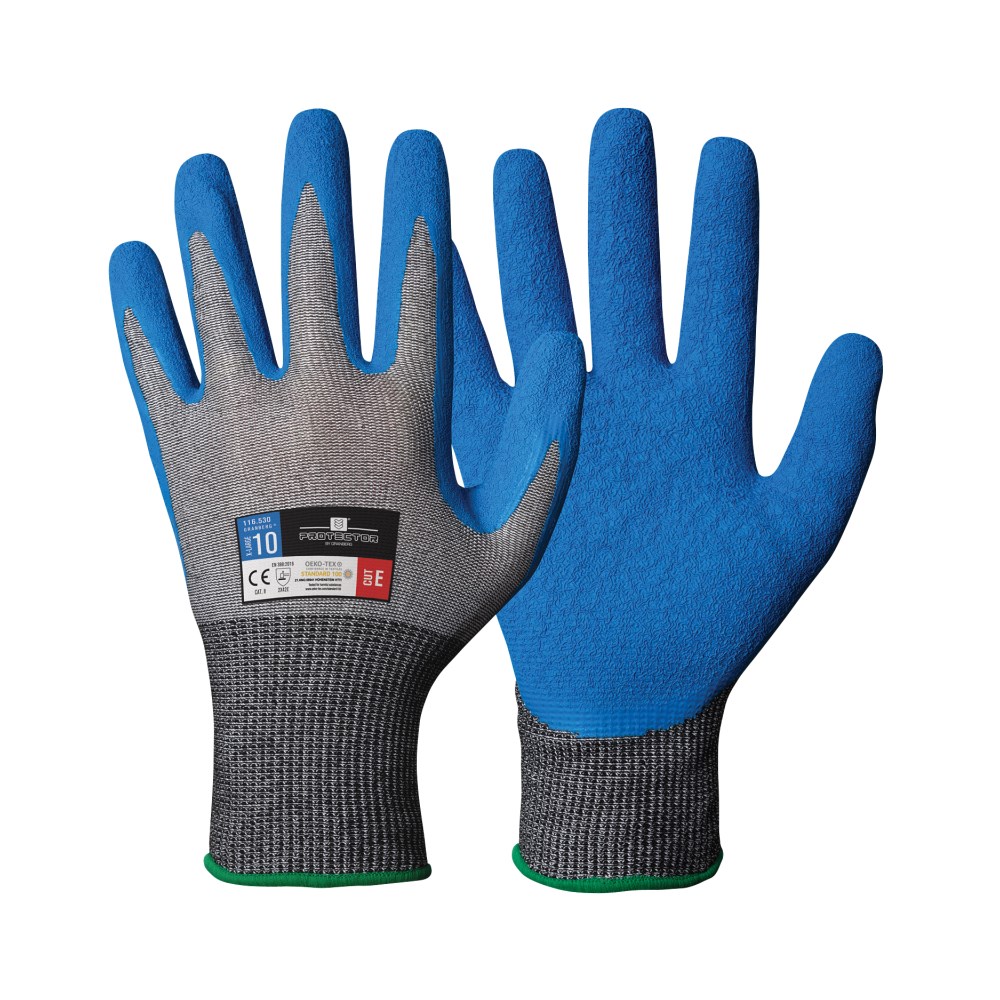 • 15-gauge fôr av Typhoon® HPPE gir meget høy kuttbeskyttelse (nivå E), perfekt for håndtering av glass, metaller og plast. • Ruflet lateks-belegg forbedrer tørt og vått grep. • Pustende fòr gir eksepsjonell komfort og fingerferdighet (nivå 5).