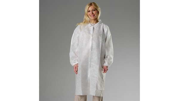 • Komfortabelt design gir stor bevegelsesfrihet. • Strikk ved håndleddet gir best mulig passform. • Laget av ikke-vevd polypropylenmateriale med trykk-knapper foran. • Egnet til direkte kontakt med matvarer.
