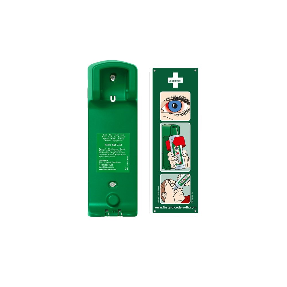 Wall bracket for the Cederroth Eye wash station 500 ml (REF 725200). Robust and practical. The wall holder ensures that everyone knows where to find the station. The container is secured in the wall holder and opens automatically when twisted out of the holder. Eye washing can begin immediately. Easily to place on any wall. Suitable for all work areas. It's a good idea to mount two stations beside each other on the wall. Accidental splashes can involve both eyes. Includes sign with instructions. Dimensions: H 27 x W 9 x D 7 cm.