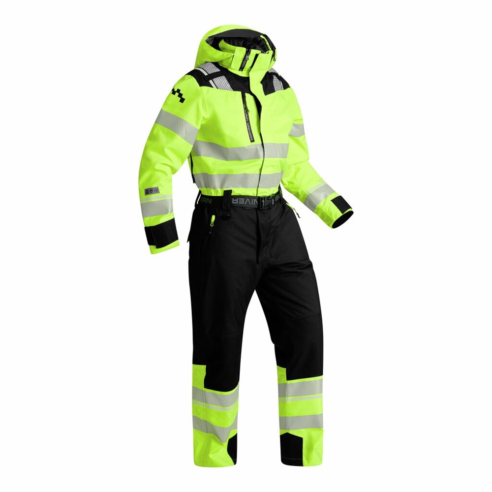 Lining in recycled polyester. 2-way zip in the front. Detachable, helmet-adapted hood with several adjustment options and reinforced screen edge for the best possible protection and visibility. Waterproof zips in the back for mechanical ventilation. Chest pocket with waterproof zips and ID card pocket. 2 leg pockets with waterproof zip and soft, warming lining in merino wool. Mobile phone pocket under buttoning. Two inner pockets. Wrist warmers with thumb grip. Adjustable sleeve ends. Elastic in the middle and elastic, removable belt. 2-way zip in trouser leg all the way up to the waist. Adjustable foot width with snow lock. Pre-bent trouser knees with internal knee protector pockets. Ruler pocket. Velcro fasteners for hammer holder.