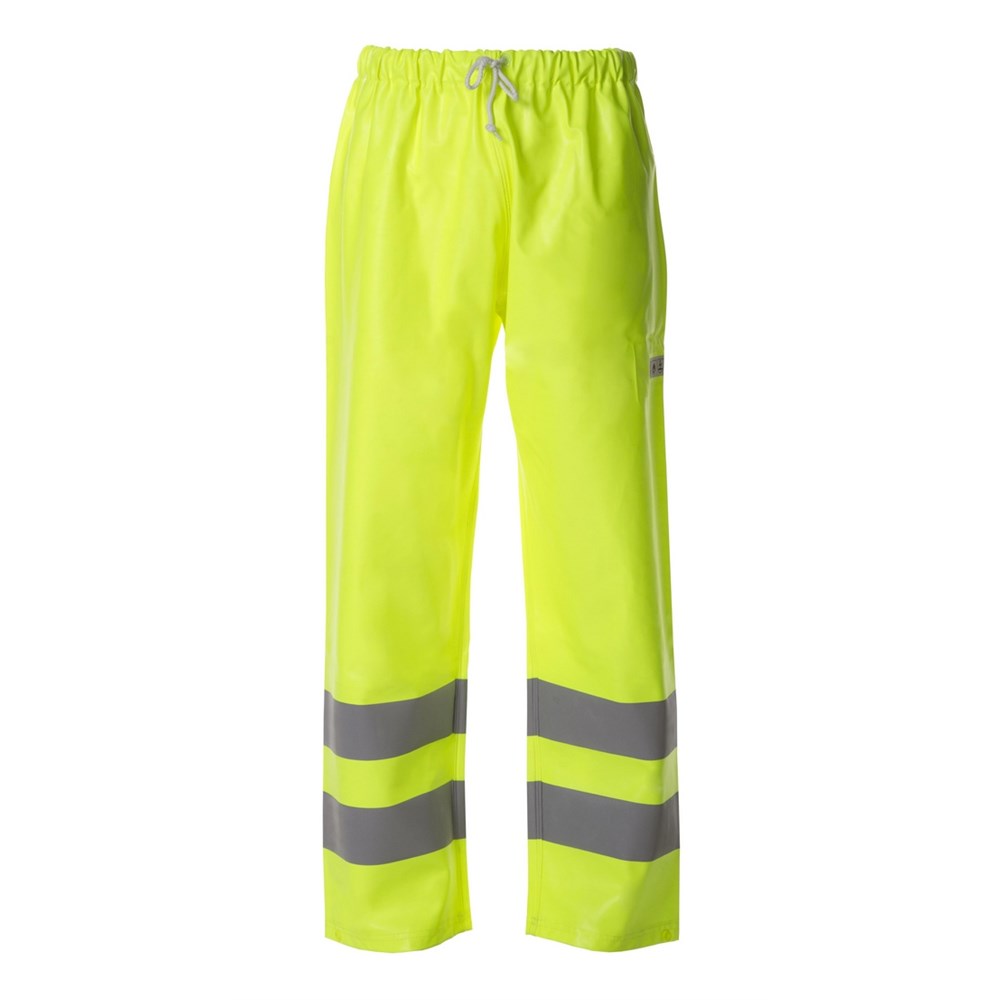 PVC belagt polyester 325g/m². Kraftig material (for mekanisk slitasje) lun innside. Sydde og sveisede sømmer. 70mm refleks. Strikk og snor i midje. Trykknapp for justering i nedkant ben.
