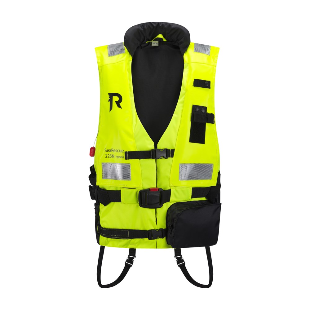 Sea Rescue Hybrid is equipped with small buckles that secure the vest in the front, an adjustable belt with a solid click buckle at the waist and a double crotch strap. It also has an inspection window, SOLAS reflectors and collar. In addition, it has an area for self-profiling on the back.